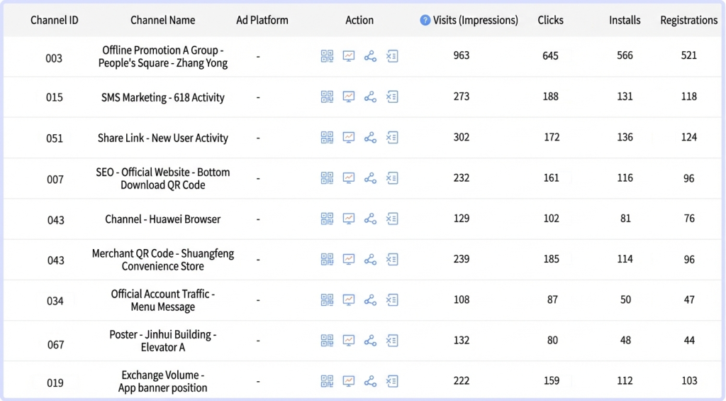 When users access this link to install the app, OpenInstall will track real-time data such as visits, clicks, installations, registrations, activity, and retention across the entire user journey, and generate independent channel reports for convenient operational analysis. This method is fully applicable to numerous promotion channels and complex business scenarios; simply create and distribute a large number of links with unique parameters, eliminating the tedious process of creating multiple channel-specific app packages.