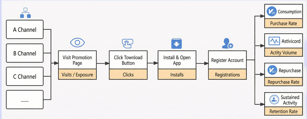 The conversion rate from exposure to clicks requires in-depth analysis of the marketing content. From the display window to the landing page content, and then to the designated download channel, every data variable in the entire conversion process is an important factor affecting the final conversion. The reach rate and churn rate at each stage can be analyzed accordingly.